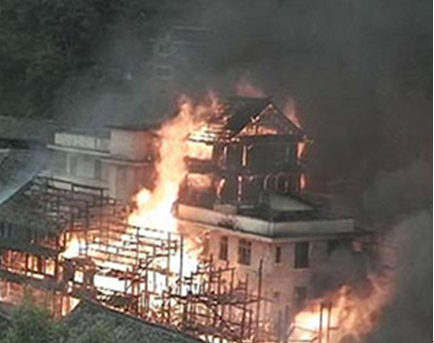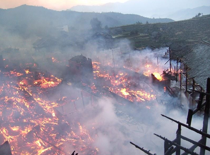 2013年3月,云南麗江古城光義街現(xiàn)文巷突發(fā)火災(zāi),燒毀民房107間;2013年4月,湖南鳳凰古城發(fā)生大火,由于消防通道狹窄無(wú)法迅速撲救,幾棟古房屋及其內(nèi)酒吧被徹底燒毀;2017年4月,古城一處街角再次發(fā)生火災(zāi);2013年8月,湖南靖州苗族侗族自治縣一古村寨發(fā)生火災(zāi),共造成58戶、248名村民房屋被燒毀;2013年10月,湖南洪江古商城清代古建筑“曾國(guó)藩兵服廠”旁一棟老民居突發(fā)大火,11戶居民無(wú)家可歸;2013年12月,洪江古商城建于清末民初的朱志大油號(hào)舊址在一次大火中付之一炬,造成22戶67人受災(zāi);頻發(fā)的火災(zāi),不僅給人民生命財(cái)產(chǎn)帶來(lái)?yè)p失,而且許多被燒毀的建筑都有上百年歷史或獨(dú)特民俗,具有較高的歷史文化價(jià)值。在廣西三江侗族自治縣,許多古村落近年來(lái)頻遭火魔侵襲,有的甚至徹底焚毀。