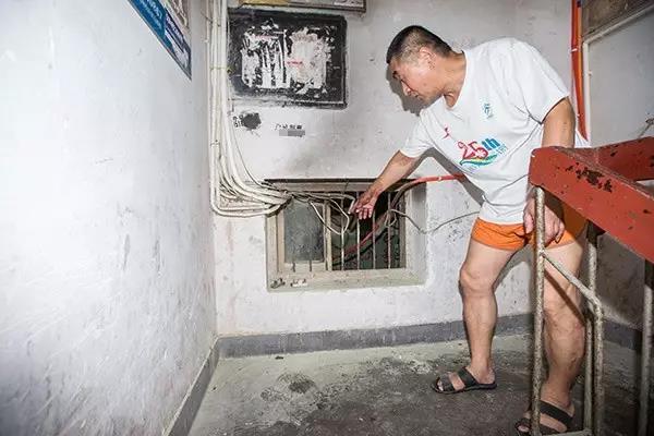 通往二樓的樓道里,一個赤膊大伯正盯著電力工人施工。樓道里還能聞到一股焦味,配電箱的墻壁明顯被熏黑了,有幾個電閘底座被燒融化了。