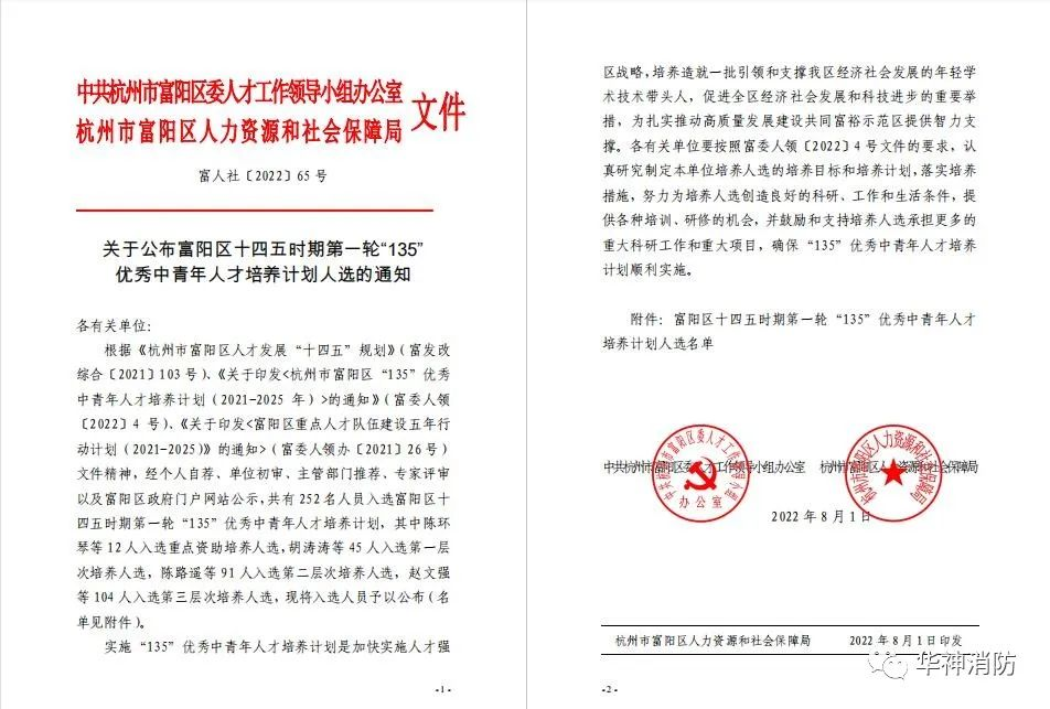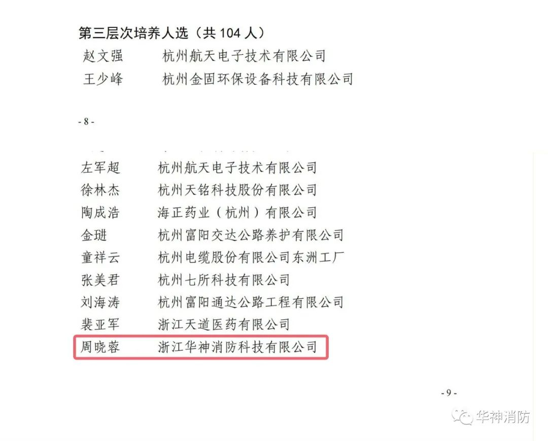 近日,杭州市富陽區(qū)關(guān)于富陽區(qū)十四五時期第一輪“135”優(yōu)秀中青年人才培養(yǎng)計劃人選名單出爐了,共有252名人員入選,其中12人入選重點資助培養(yǎng)人選,45人入選第一層次培養(yǎng)人選,91人入選第二層次培養(yǎng)人選,104人入選第三層次培養(yǎng)人選。這些人選是從生產(chǎn)、科研、教育、衛(wèi)生、文創(chuàng)、現(xiàn)代農(nóng)業(yè)等各個領(lǐng)域的優(yōu)秀專業(yè)技術(shù)人員中選拔產(chǎn)生的。此次值得慶祝的是,浙江華神消防科技有限公司榜上有名,我司周曉蓉成為第三層次培養(yǎng)人選。